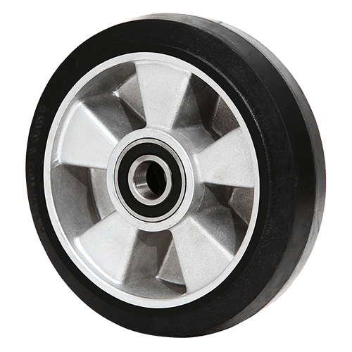 Диаметр внутренней оси 20 мм. Ширина обода 50 мм, что обеспечивает хорошую устойчивость. Грузоподъёмность 600 кг. На светлых полах может оставлять тормозной след. Устанавливается в гидравлические тележки разной грузоподъёмности, которые будут использоваться на грубых и неровных поверхностях.