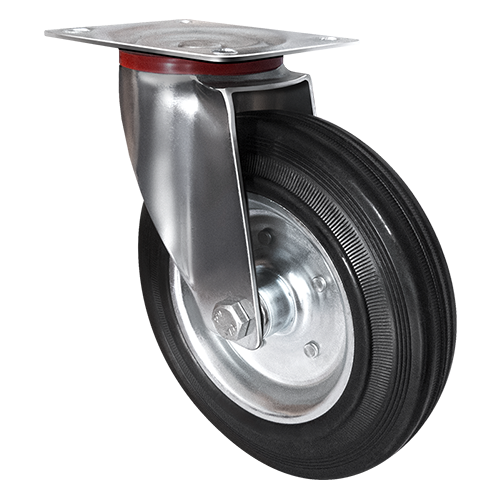 Колесная опора с колесом со стальным оцинкованным ободом и литой шинкой из резины черного цвета. В оси роликовый подшипник, который выдерживает большие нагрузки, чем подшипник скольжения. Кронштейн с платформенным типом крепления изготовлен из оцинкованной стали. Подшипник в поворотном узле защищён пластиковым пыльником.