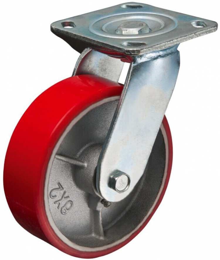 Большегрузные поворотные колёсные опоры с шинкой из износостойкого полиуретана scp63 имеют грузоподъемность 360 кг. Диаметр колеса 150 мм. Обод отлит из чугуна, усилен рёбрами жёсткости. В конструкции применен сварной оцинкованный кронштейн. В ступице применен роликовый подшипник, а в поворотном механизме – двухрядный шарикоподшипник. Температурный режим от -35°С до +50°С.