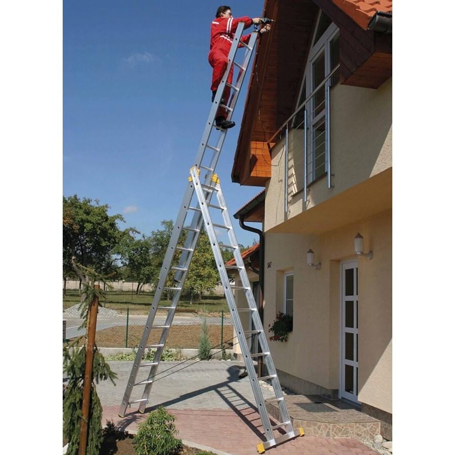 Трехсекционная, универсальная алюминиевая лестница. Может применяться в качестве приставной, раздвижной лестницы, а также стремянки.