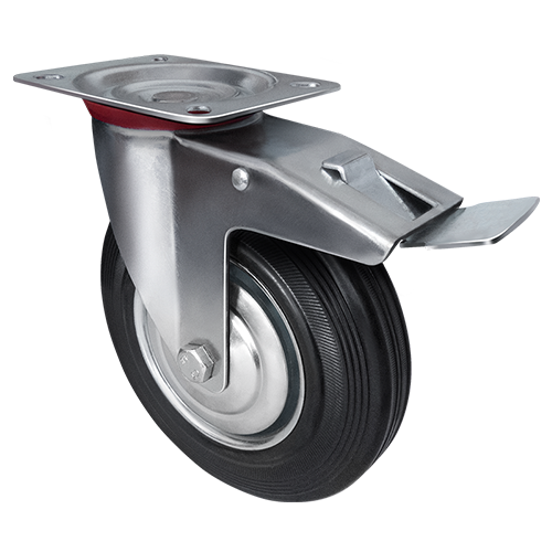 Колесная опора с поворотным кронштейном и тормозом. Обод – стальной, оцинкованный, шинка литая, из чёрной резины. В оси роликовый подшипник, который выдерживает большие. Кронштейн с платформой для крепления изготовлен из оцинкованной стали.